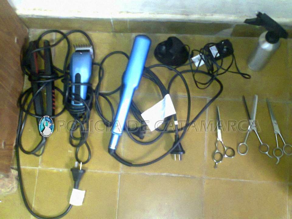 De una bloquera ubicada en la calle Eulalia Ares de Vildoza, frente a la Liga Chacarera, los investigadores secuestraron una pava eléctrica, en una vivienda de la calle Bernardino Ahumada S/Nº procedieron al secuestro de dos planchitas para el cabello, una máquina para cortar cabello con su respectivo cargador, tres tijeras y un rociador; mientras que durante un rastrillaje realizado en un descampado de la zona encontraron otro rociador, spray y gel para el cabello.