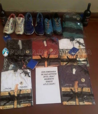 En la mañana del martes, a las 10:00, efectivos de la Subcomisaría de San Antonio procedieron a la aprehensión de Franco Fernández (18) y a la demora de un adolescente de 17 años de edad, quienes habrían ingresado a un domicilio ubicado en la esquina de la ruta provincial Nº 41 y calle Gaspar Guzmán de esa localidad del Departamento Fray Mamerto Esquiú, propiedad de una familia de apellido Álvarez, y sustrajeron varias prendas de vestir, tres pares de zapatillas y dos botellas de vino que quedaron en calidad de secuestro.