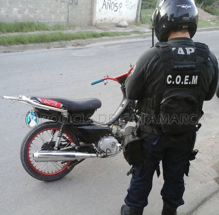 Anoche, a las 20:00, durante un recorrido preventivo en inmediaciones a la esquina de calle Alpatauca y Pasaje Sin Nombre, efectivos del Cuerpo de Operaciones Especiales Motorizadas (COEM) procedieron a la demora de un adolescente de 17 años de edad, quien circulaba en una motocicleta Corven 110 cc., de color negro, sobre la cual pesaba un requerimiento judicial en virtud de una denuncia penal radicada por un hombre de apellido Rojas en la Unidad Judicial Nº 4, el día 10 de Noviembre del año en curso, por la sustracción de la misma.
