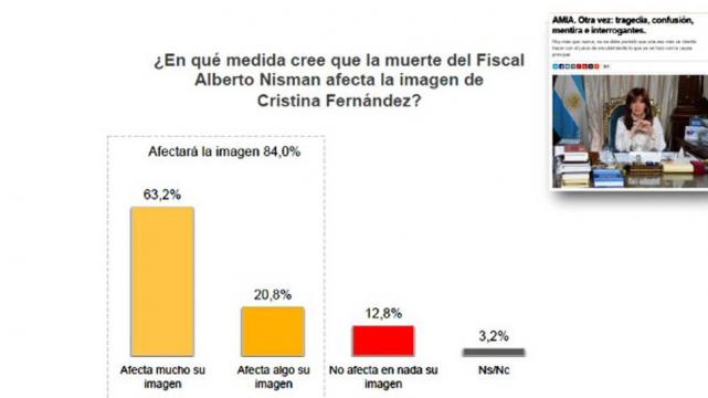 De los encuestados, el 63,2% estima que la muerte del fiscal “afecta mucho” la imagen presidencial, mientras el 20,8% dice que “afectará algo”. Y sólo el 12,8% aclaró que no le afectará en nada la visión que la gente tiene sobre Fernández de Kichner, según reproduce Cronista.com.