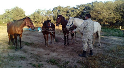A las 08:30 de la mañana de hoy, en la Ruta Nacional Nº 38, inmediaciones al acceso sur a la Ciudad Capital, efectivos de la División Policía Montada, dependiente de la Dirección de Unidades Especiales de la Policía de la Provincia, en cumplimiento de las disposiciones de la Ley Provincial Nº 4851/95, procedieron al secuestro de una (1) yegua baya listada con marca de fuego no legible, una (1) potranca de pelaje colorado sin marca de fuego, una (1) yegua colorada frontina con marca de fuego, y un (1) caballo colorado frontino con miembros posteriores de color blanco, con marca de fuego no legible.
