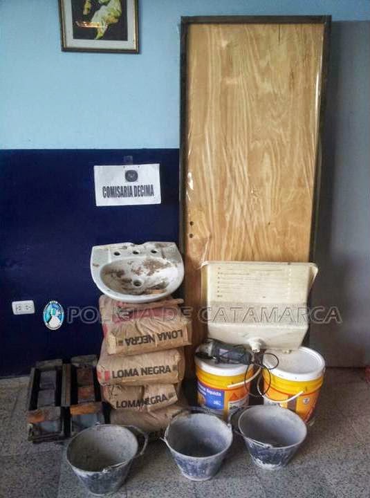 Tras constituirse en el lugar, los propietarios de los inmuebles entregaron en forma voluntaria tres (3) tubos de metal de 5 Mts. de largo, un (1) lavatorio de color blanco, una (1) pileta de plástico de color blanco, dos (2) caños de PVC de 110 cm., de 5 Mts. de largo cada uno, dos (2) bloqueras de molde tamaño 15, dos (2) tachos de membrana liquida de 20 Lts., marca SIKA, cuatro (4) bolsas de cemento, una (1) amoladora marca Bosh de color verde, dos (2) chapas de zing, una de ellas de 4 y otra de 2 1/2 Mts. respectivamente, tres (3) baldes de albañil, un (1) martillo, una (1) martelina, una (1) puerta placa de madera, y un (1) rollo de manguera de plástico de color negro, de los cuales no pudieron acreditar la legítima propiedad y procedencia.