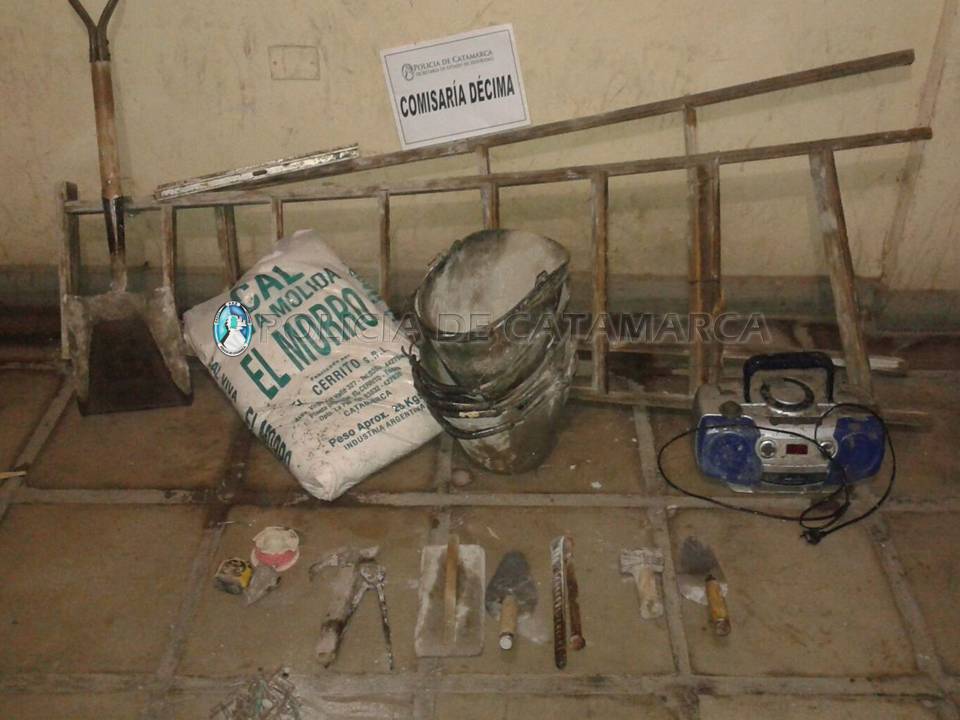 A las 04:25 de la madrugada del sabado, mientras efectivos de la Comisaría Décima realizaban recorridos de prevención procedieron a la aprehensión de José Luis Maximiliano Ferreyra (20), quien habría sido sorprendido in fraganti cuando sustraía del interior de una obra en construcción ubicada en la intersección de calle La Rioja y Av. Alem una (1) bolsa de cal, una (1) escalera tijera, un (1) nivel de mano, una (1) pala, un (1) radiograbador Nóblex de color gris, seis (6) baldes de plástico, dos (2) cucharas de albañil, una (1) plomada, una (1) maza, dos (2) corta fierros, un (1) fletacho, una (1) tenaza, un (1) martillo, una (1) cinta métrica, un (1) ovillo de tanza y un (1) carretel de tanza, que quedaron en calidad de secuestro.